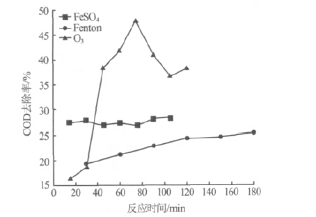 從圖 2 可以看出,以硫酸亞鐵為絮凝劑時,隨著反應時間的增加,COD 去除率沒有明顯的變化,說明反應時間對COD 去除率沒有明顯的影響。但據文獻報道,如果反應時間太短,硫酸亞鐵與廢水不能充分反應,所以反應時間以15 min 為宜。Fenton 試劑法中,反應時間對COD 去除率有一定的影響,但不是很明顯,當反應時間為2 h 時,COD 去除率基本達到穩定。臭氧氧化反應中,反應時間對COD 去除率的影響比較明顯,臭氧反應1.25 h 時,COD 去除率達到最高。