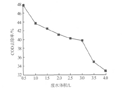 在上述最佳反應條件下,考察了廢水體積對臭氧氧化去除COD 的影響,結果如圖 3 所示。