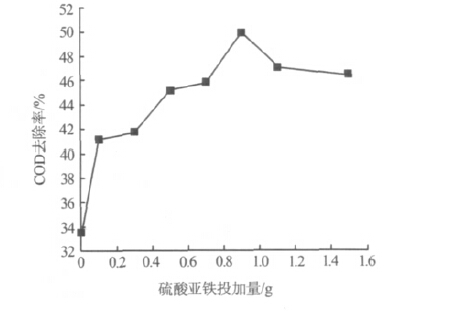 從圖 4 可以看出,當硫酸亞鐵投加量為0 時, COD 去除率只有33.58%,隨著投加硫酸亞鐵量的增加,COD 去除率逐漸增大,當硫酸亞鐵投加量為 0.9 g 時,COD 去除率達到最大,為49.93%。在硫酸亞鐵與臭氧氧化的共同作用下,廢水的COD 去除率較單獨臭氧氧化提高很多,廢水的沉淀性能也有很大的改善,使泥水分離更加容易。