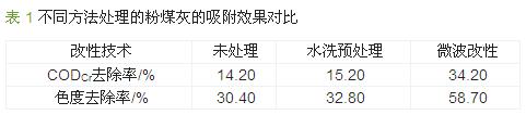 由表 1 可知,在相同條件下,經水洗預處理的粉煤灰對垃圾滲濾液中的CODCr 和色度的處理效果比未經處理的粉煤灰略有提高,但并不顯著;而粉煤灰經微波改性后,對垃圾滲濾液中的CODCr 和色度的處理效果均大幅度提高,CODCr 去除率由14.20%提高至34.20%,色度去除率由30.40%提高至58.70%,說明微波改性后粉煤灰的吸附能力顯著提高,這可能是因為微波改性既會影響粉煤灰表面的孔隙結構,又會影響粉煤灰表面的化學性質,同時還可使活化過程速率加快,化學反應歷程改變,降低反應活化能等〔7〕,最終使微波改性粉煤灰活性大增。因此,以下實驗均以微波改性粉煤灰作吸附劑。
