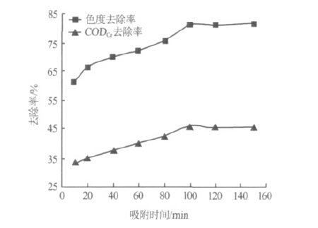 圖 4 吸附時間對CODCr和色度去除率的影響