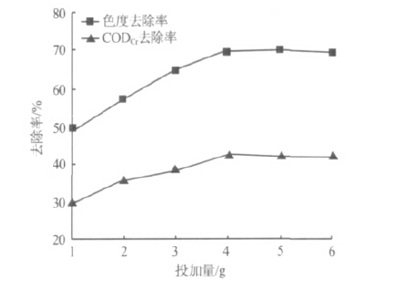 圖 5 改性粉煤灰投加量對CODCr和色度去除率的影響
