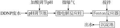 微電解工藝利用鐵屑中的鐵和顆粒炭組分分別構成微原電池的正極和負極,以充入的廢水為電解質溶液,通過氧化-還原反應對廢水進行處理,其具有成本低廉、效果好的特點,在印染、石化和制藥等化工廢水的治理中有較多應用〔3, 4, 5〕。Fenton試劑氧化法是利用H2O2在Fe2+催化作用下生成氧化能力很強的羥基自由基(·OH)〔6〕,·OH可無選擇地氧化水中的多數有機物,具有反應迅速、無二次污染等優點,已被更多應用于難降解廢水的處理當中〔7, 8, 9, 10〕。將微電解工藝與Fenton高級氧化法耦合,能夠彌補微電解工藝填料易鈍化、板結現象和Fenton高級氧化法成本高的不足。近年來,微電解-Fenton組合工藝已較多地應用于TNT廢水、硝基苯廢水和垃圾滲濾液等有害廢水的處理中〔11, 12, 13〕,但是在DDNP廢水的處理上還鮮有報道。筆者通過實驗確定了微電解-Fenton耦合預處理DDNP廢水的最佳工藝條件,以期在生物處理前更經濟高效地提高DDNP廢水的可生化性,便于后續的處理。