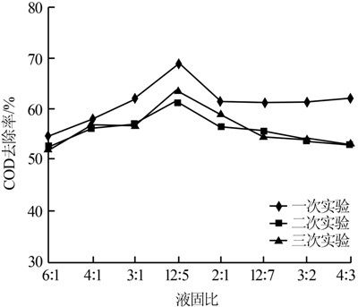 由圖 2可以看出,隨著液固比的增大,COD去除率先升高后下降。當液固比小于12∶5時,COD去除率逐漸上升,液固比大于12∶5時,COD去除率先下降后趨于穩定。液固比較大時,即當微電解填料投加量過高時,Fe2+的絕對生成量增加,反應液中瞬間積存大量的Fe2+,致使COD升高。同時微電解填料用量太多,在實際運行時易堵塞,從而增大損失,成本也高。因此選擇液固比為12∶5。