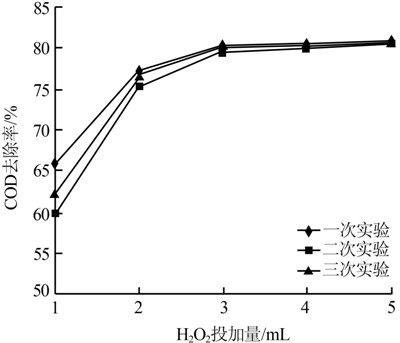 常溫下取實驗廢水100 mL于燒杯中,調節廢水初始pH=5,攪拌的同時依次加入現配的0.3 mol/L FeSO4 3 mL及1~5 mL H2O2,反應2.0 h后檢測COD,3組平行實驗結果見圖 3。