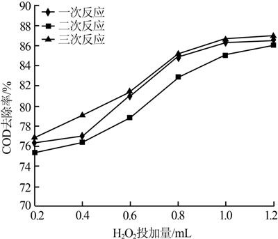 先進行兩組平行微電解實驗,廢水的初始pH=2,液固比為12∶5,反應2.0 h后取6份100 mL出水,依次加入不同投加量的H2O2,反應2.0 h后調節出水pH為8~9,靜置沉淀,測定上清液COD的去除率,3組平行實驗結果見圖 4。