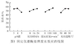 (2)通過正交試驗設(shè)計方法優(yōu)化了固定化漆酶處理造紙廢水的反應(yīng)條件。最佳反應(yīng)條件是:pH 為4,反應(yīng)時間為24h,搖床轉(zhuǎn)速為160r/min,反應(yīng)溫度為40℃,此時廢水脫色率可達(dá)70%。