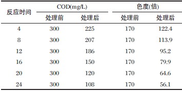 由表4 可知,增加轉(zhuǎn)速,即增加溶液中的氧氣的供應(yīng)量,對最終的處理效果是有利的,可以更好地降低廢水的COD 和色度。但在實際應(yīng)用中,要綜合考慮氧氣供應(yīng)所需的動力消耗和處理效果之間的關(guān)系,在兩者之間尋求一個平衡。