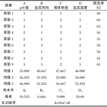 根據(jù)單因素試驗結(jié)果,pH 值、溫度、反應(yīng)時間和搖床轉(zhuǎn)速等都會對處理效果有影響。所以選取這四個影響因素,每個因素選取三個水平值,設(shè)計一個L9(34)正交試驗[10],測定在各條件下固定化漆酶對造紙廢水的脫色率。根據(jù)正交試驗結(jié)果和方差分析結(jié)果得出各因素最佳水平,從而確定出最佳反應(yīng)條件。