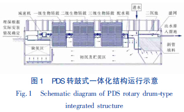 從圖1 可以看出,PDS 轉鼓式一體化裝置的核心是旋轉生物處理單元,初沉池沉降大部分懸浮物及無機顆粒物之后,處理水進入缺氧池進行反硝化,實現生物脫氮,之后進入生物轉鼓高效降解污染物,伴隨著反應的進行,老化的生物膜在二沉池里得以沉降去除。