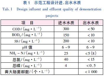 本示范工程規模為50 m3/d,占地面積為300m2,工程納污戶數150 戶,總人數為450 人,污水主要來源是居民廚房污水、浴室洗澡污水及其他公共場所的沖廁污水等。