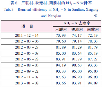 通過實驗方法分別測得三聯村、狹港村和南前村的進、出水COD 值,并計算得出各村的COD 去除率,如表2 所示。