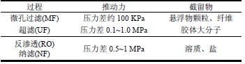 膜按表面孔徑的大小,一般可分為微濾膜、超濾膜、納濾和反滲透膜,其分離目標見表1。常用于MBR 處理工藝中的是微濾膜和超濾膜。