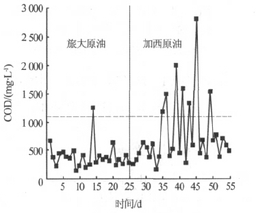 加西原油加工期間產(chǎn)生污水COD 變化情況如 圖 2 所示。