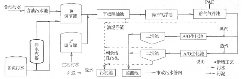 為了確保污水處理場外排水達(dá)標(biāo)排放,在現(xiàn)有污水處理場設(shè)施的前提下,采取了一系列措施:(1)含硫污水經(jīng)污水汽提處理。為避免污水處理場進(jìn)水水質(zhì)硫化物含量超標(biāo),含硫污水先經(jīng)過污水汽提裝置,將其中的硫化物部分轉(zhuǎn)化為H2S,減小混合后污水的硫化物含量。