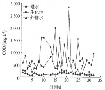 生化池馴化過程中,監(jiān)測到的COD 變化情況如 圖 4 所示。