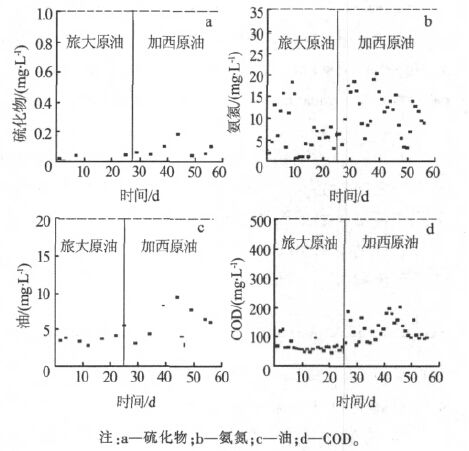(2)加工加西原油產(chǎn)生污水pH 較大、硫化物含量低、氨氮含量低、含油量低、COD 高。具體參見http://www.xhxdt.com更多相關(guān)技術(shù)文檔。