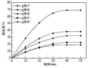 在三氯化鐵投加量為200 mg/L,皂土投加量為1 g/L,反應溫度為20 ℃,活性藏青廢水初始濃度為10 mg/L 的條件下進行實驗,考察混凝攪拌時間和pH 對混凝處理過程的影響,結果如圖4 所示。從圖4 可以看出,不同的pH 對混凝法去除水樣的色度很有效果。隨著攪拌時間和pH 的增加,出水的吸光度逐漸減小,色度去除率逐漸增大。當攪拌時間為30 min,pH 為7 時,出水吸光度顯示最小值0.026,色度去除率為64.8 %。繼續增加攪拌時間和增大pH,出水的處理效果并沒有隨之提高,而色度去除率也沒有不斷提高。這可能是因為當攪拌時間適宜、有機物濃度較高的時候,攪拌時間的增加有利于分子間的碰撞,它們反應劇烈,所以廢水的處理效果明顯提高[6]。當攪拌時間過長時,反應已達飽和,色度去除率無太大變化。本實驗表明,混凝的最適pH 為7,攪拌時間適宜用30 min 左右。