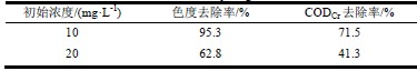 表1 不同初始濃度下臭氧混凝聯用工藝對廢水色度和CODCr 去除率的對比