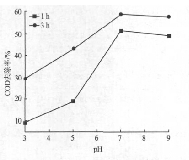 取1 700 mL 甲基嘧啶磷工業廢水,固定極板間距為1 cm,電流密度為0.020 A/cm2,蠕動泵循環流量1 800 mL/min,調整初始pH 分別為3、5、7、9,在反應1 h 和3 h 時分別取樣。初始pH 對甲基嘧啶磷廢水中COD 去除率的影響如圖 1 所示。