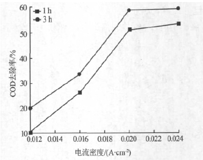 由圖 2可知,隨著電流密度的增加,COD 去除率逐步增大,電流密度為0.024 A/cm2 時電解3 h,COD 去除率可達60.0%。這主要是因為電流密度的增加使得電極的催化活性增大,加快了電化學反應速度。當電流密度由0.020 A/cm2 增大到0.024 A/cm2 時, COD 去除率增加幅度已不明顯,這可能是因為隨著電流密度的增加析氧副反應加劇,熱量損失增加,導致電解效率降低〔5〕。從降解效果及經濟方面考慮 0.020 A/cm2 為較適宜的電流密度。