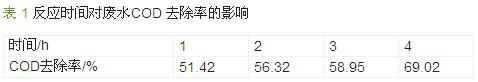 取1 700 mL 甲基嘧啶磷工業廢水,固定初始 pH 為7,極板間距為1 cm,蠕動泵循環流量1 800 mL/min,電流密度0.020 A/cm2,反應4 h,每隔1 h 取樣。反應時間對甲基嘧啶磷廢水COD 去除率的影響如表 1 所示。