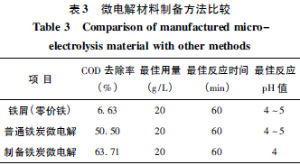 將制備鐵炭微電解材料處理NB 廢水效果與鐵屑(零價鐵) 法、普通鐵碳微電解法進行靜態實驗比對以此驗證新材料的有效性。為了使各條件、效果有可比性,選用影響微電解處理的主要參數pH 值、反應時間及投加量作為控制條件[15],并基本保持在相同實驗條件下進行[16],對比結果如表3 所示。