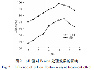 由圖2 可知,當反應溶液pH 值在4 到6 范圍內,NB 和COD 都保持著較高的去除率,而當反應pH 值增大到6 以后時,COD 去除率急劇下降。這與Rivas 等[17]研究硝基苯在偏中性條件下Fenton反應效果最好的研究成果吻合。這是因為pH 值過低時,溶液中的H+濃度過高,Fe3+不能還原成Fe2+,催化反應受阻,造成Fenton 試劑氧化能力減弱。pH 值大于5 時,隨著溶液中OH -逐漸增多,H2O2和Fe2+發生逆反反應,不能生成·OH,同時鐵離子形成沉淀,不能催化H2O[18]2,抑制了Fenton 試劑的有效形成,使得處理效果下降。在整個實驗pH值范圍內,NB 去除率始終在80% 以上,考慮工程實際運行中降低處理費用,減少堿的用量,綜合考慮pH 值取5。
