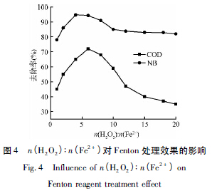 由圖3 可以看出,在m(H2O2)∶m(COD) 較小時,COD 和NB 的去除效果都在不斷增加,而當m(H2O2)∶m (COD) 達到2. 5 時,NB 去除率為94. 8%,而COD 去除率達到頂峰,為63. 2%,隨著m(H2O2)∶m(COD) 繼續增加,NB 去除率基本保持穩定在90% 以上,COD 去除率開始下降。當H2O2投加量較低時,由于H2O2不足,產生的·OH 量少,不足以使有機物充分降解,去除率較低,隨著H2O2投加量增大,產生的·OH 量也開始增多,全部參與有機物降解反應,而H2O2投加量過高時,反應開始大部分Fe2+就被氧化為Fe3+,沒有足夠的Fe2+來分解過量的H2O2產生更多的·OH,這樣既消耗了H2O2,又抑制了·OH 的產生,并且殘留的H2O2也使出水COD 值增高[19],使得處理效果又會降低。綜合考慮之后,Fenton 實驗H2O2最佳投加量m(H2O2)∶m(COD) 定為2.5,同時為有利于降解NB,H2O2投加方式采用分批投加[20]。