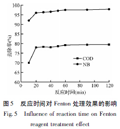 由圖5 可知,在反應20 min 時CODcr 和NB 去除率分別達到了92. 3%和76. 7%,隨著反應時間延長,COD 和NB 去除率變化不大,基本都維持在平衡水平。研究發現,反應前期主要是由Fe2+催化H2O2分解成·OH 完成Fenton 氧化反應,由于·OH具有較高的電負性和電子親和能,使得反應在短時間內就可完成,當Fe2+因為反應的消耗而迅速減少后,氧化反應就轉為由Fe3+催化的類Fenton反應,速度很慢,去除率趨于平衡。同時,經過前段微電解柱反應使得出水中可能攜帶了新型鐵炭填料溶解出的微量催化金屬,這對提高Fenton 反應速率及H2O2利用率也起到一定的協同作用,加快了反應時間。因此,最佳反應時間定為20 min。