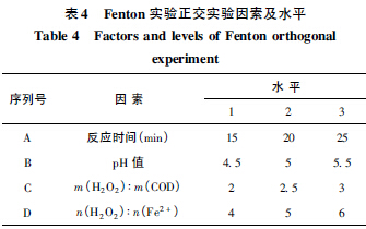 為考察Fenton 試劑對NB 廢水的處理效果,以微電解柱出水作為Fenton 實驗的原水,研究不同因素對Fenton 試劑處理NB 廢水的影響。影響Fenton試劑處理NB 廢水的因素很多,其中包括: 廢水的負荷、廢水的pH 值、Fe2+的濃度、Fe2+的投加量、H2O2的濃度、H2O2的投加量、反應時間及反應溫度等多種因素。根據相關資料,本實驗確定了對處理NB廢水影響較為顯著的4 個因素: 廢水的pH 值、n(H2O2):n(Fe2+)、m(H2O2):m(COD) 和反應時間作為考察因素。