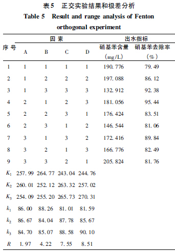 通過單因素實驗確定了Fenton 試劑顯著影響因素和最佳條件范圍,以硝基苯去除率作為評價指標,按L9(34)正交表進行正交實驗。并通過極差法確定各影響因素的主次和最佳組合。實驗結果及其分析如表4 和表5 所示。