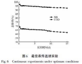 由圖6 可知,反應初期時NB 去除率高達96. 8%,COD 去除率達68. 3%,之后處理效果下降,實驗初期較高的去除率可能由平衡較快的吸附作用引起。2 ~ 10 d 時,NB 去除率維持在95. 5% 到93. 7%之間,處理效果較為理想。從10 d 到15 d,NB 和COD 去除率逐漸下降,但是仍然可以維持在較高水平。新型微電解材料在連續實驗運行結束后,填料有部分已經開始結塊,但較傳統微電解而言,本填料板結時間明顯延后。新型微電解材料在制備過程中結合了反應電極的合金結構、介孔尺寸、模具規整化特征及對填料層曝氣等條件對填料板結起到一定的緩解作用,雖然在較長的時間內會板結,但較傳統微電解填料抗板結性能有明顯的改善。具體參見http://www.xhxdt.com更多相關技術文檔。