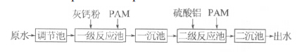 目前,國內外對高氟廢水的處理方法主要有化學沉淀法、反滲透法、混凝沉淀法、吸附法、電化學法等〔4, 5〕,其中化學沉淀法、混凝沉淀法以及吸附法應用最廣泛,傳統的工藝流程就是化學沉淀法加混凝沉淀法〔6, 7〕,也有研究在此基礎上增加吸附法〔8, 9〕。陜西省某太陽能電池生產企業采用一級鈣鹽除氟,二級鋁鹽除氟的兩級除氟工藝處理其產生的含氟廢水,工藝流程如圖 1 所示。其中一級處理是用氫氧化鈣調節廢水pH≥11 以沉淀氟離子,二級處理是用硫酸鋁反調pH 并控制pH≈7 來混凝沉淀除氟。