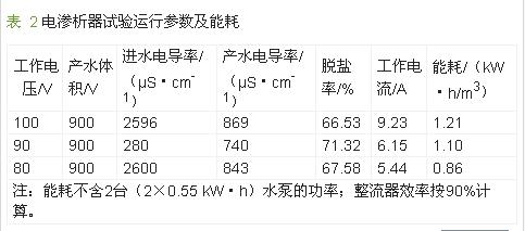 通過整流器的電流表、電壓表直接讀出工作電流和電壓,并按式(1)、式(2)計算脫鹽率、耗電量。