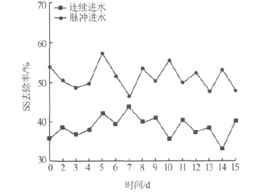 懸浮物指懸浮在水中的固體物質,包括不溶于水中的無機物、有機物及泥砂、黏土、微生物等。廢水中懸浮物含量是衡量水污染程度的指標之一,懸浮物也是造成反應器出水渾濁的主要原因。水體中的有機懸浮物沉積后易厭氧發酵,使水質惡化,導致反應器運行不穩定。試驗期間考察了兩種進水方式下,系統對SS 的去除率,結果見圖 5。