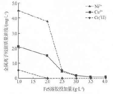 取200 mL 模擬廢水于250 mL 燒杯中,以1.0mol/L 硫酸溶液調節pH 為4.0,分別加入1.0、2.0、2.5、3.0、3.5、4.0 g/L 10%的納米FeS 溶膠,置于磁力攪拌器上攪拌15 min; 以2.0 mol/L NaOH 溶液調節pH 為8.0,加入1 mL 質量分數為0.5%的聚丙烯酰胺(PAM)溶液,靜置5 min,濾紙過濾,測定濾液中的金屬離子濃度。納米FeS 溶膠用量對處理效果的影響如圖 1 所示。