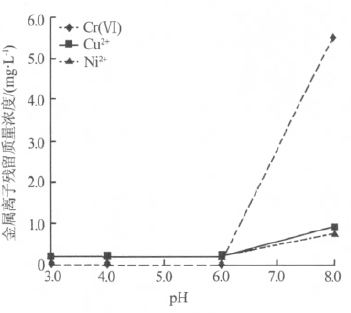 取200 mL 模擬廢水于250 mL 燒杯中,以1.0mol/L 硫酸溶液和/或2.0 mol/L NaOH 溶液分別調節pH 至3.0、4.0、6.0、8.0,加入3.0 g/L 10%的納米FeS溶膠,置于磁力攪拌器上攪拌15 min; 調節pH 為8.0,加入1 mL 0.5% 的PAM 溶液,靜置5 min,濾紙過濾,測定濾液中的金屬離子濃度。pH 對處理效果的影響如圖 2 所示。