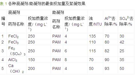 為了選定合適的混凝劑及助凝劑,在探索階段通過序批式試驗對各種常用混凝劑的混凝效果進行了比較。根據鋁型材表面處理廢水的特點及后續廢水處理方案的需要,試驗中選用濁度,Al3+、SO42-去除率及絮凝體的沉降性能作為衡量指標,以尋求最佳混凝劑及投加量。