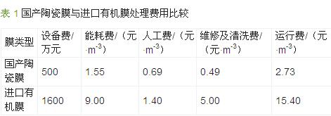 超濾法處理含油廢水關(guān)鍵在于超濾膜的選擇,超濾膜包括有機(jī)膜和無機(jī)膜。最早采用的超濾膜為有機(jī)膜,如醋酸纖維素膜、聚酰胺膜、聚醚砜膜等,但有機(jī)膜售價高、不耐高溫、容易水解且不易清洗。20世紀(jì)90 年代,南京化工大學(xué)研制出了以氧化鋯、氧化鋁等為材料的無機(jī)陶瓷膜。無機(jī)陶瓷膜除具有有機(jī)膜分離方法的優(yōu)點外,還具有耐高溫、耐強(qiáng)酸、耐氧化及耐有機(jī)溶劑的侵蝕特性,機(jī)械強(qiáng)度高,使用壽命長,截油率高,清洗再生性能好等優(yōu)點。寶鋼采用國產(chǎn)無機(jī)陶瓷膜對2030 冷軋含油廢水進(jìn)行處理〔14〕,并與進(jìn)口有機(jī)膜進(jìn)行對比。測試結(jié)果表明,無機(jī)陶瓷膜的滲透量是有機(jī)膜的2~3 倍,油類和COD 的去除率也高于有機(jī)膜。唐鋼還對國產(chǎn)陶瓷膜與進(jìn)口有機(jī)膜處理冷軋含油廢水的各項費用進(jìn)行了比較〔15〕,處理量為10 m3/h。國產(chǎn)陶瓷膜與進(jìn)口有機(jī)膜相比,具有明顯的成本優(yōu)勢,結(jié)果如表 1 所示。