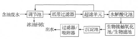 (3)超濾-MBR 工藝。該工藝主要是先將含油廢水經(jīng)調(diào)節(jié)池調(diào)節(jié)后用紙帶過濾機(jī)過濾,去除粗渣后進(jìn)入到超濾系統(tǒng)進(jìn)行油水分離,超濾出水進(jìn)入膜生物反應(yīng)器進(jìn)一步處理。該工藝出水水質(zhì)好,處理效率高,但需要嚴(yán)格控制操作條件與工藝參數(shù),盡可能減輕膜污染,提高膜組件的處理能力和運行穩(wěn)定性。