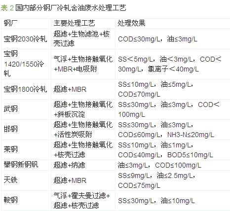 目前,國內(nèi)鋼廠冷軋含油廢水的處理多采用超濾技術(shù),并將超濾技術(shù)與生物技術(shù)和MBR 相組合,使出水的SS 和油類物質(zhì)得到了較好的控制,但對COD 的處理仍然沒有達(dá)到理想效果。國內(nèi)主要鋼廠冷軋含油廢水處理現(xiàn)狀如表 2 所示。
