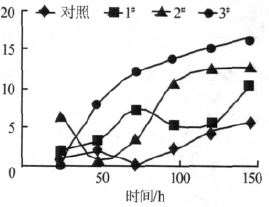 在放線菌的試驗中,隨著放線菌投加量的增加,廢水的處理效果降低。對于這一現象,筆者認為有以下兩種可能的原因:(1)放線菌對該類廢水沒有去除能力,加入的放線菌基本都死亡、分解,從而使得加入的放線菌量越大處理效果越差;(2)該類廢水中只有一小部分的營養物質可供放線菌生長,由于該類物質的含量較少,只能供養很少一部分的放線菌,因而隨著放線菌用量的增加,微生物之間的競爭加劇,使得大量微生物由于缺乏營養物質而死亡、分解,造成對廢水處理效果的下降。