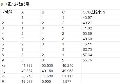 廢水在4 000 r/min 的離心機中離心5 min,取上清液測定其中的COD。COD 的測定采用快速消解分光光度法(HJ/T 399—2007),分光光度計采用Hach公司生產的DR2800 便攜式分光光度計。正交試驗結果采用SPSS 軟件進行分析。