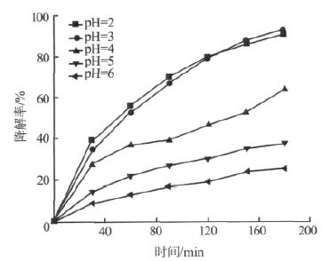 調(diào)節(jié)p-NA 廢水溶液的pH 分別為2.0、3.0、4.0、5.0、6.0 時,在UV/Fe0 體系中考察p-NA 的降解情況,結(jié)果如圖 2 所示。