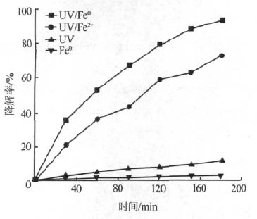 在UV/Fe0體系中,F(xiàn)e2+可以由Fe0 氧化得到,而H2O2由UV照射H2O 產(chǎn)生激發(fā)態(tài)HO2·而得到,由此在UV/Fe0 體系中形成Fenton 反應(yīng),并且無需另外添加H2O2,在這過程中紫外燈作為氧化Fe0 和產(chǎn)生H2O2的能源。