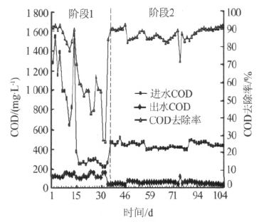 圖 2 厭氧MBBR-好氧MBR 工藝對合成革廢水中COD 的降解效果