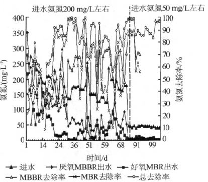 圖 3 厭氧MBBR 和好氧MBR 對氨氮的去除效果