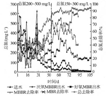圖 4 厭氧MBBR 和好氧MBR 對總氮的去除效果