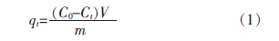 式中:qe———平衡時吸附劑對酸性品紅的吸附量, mg/g;